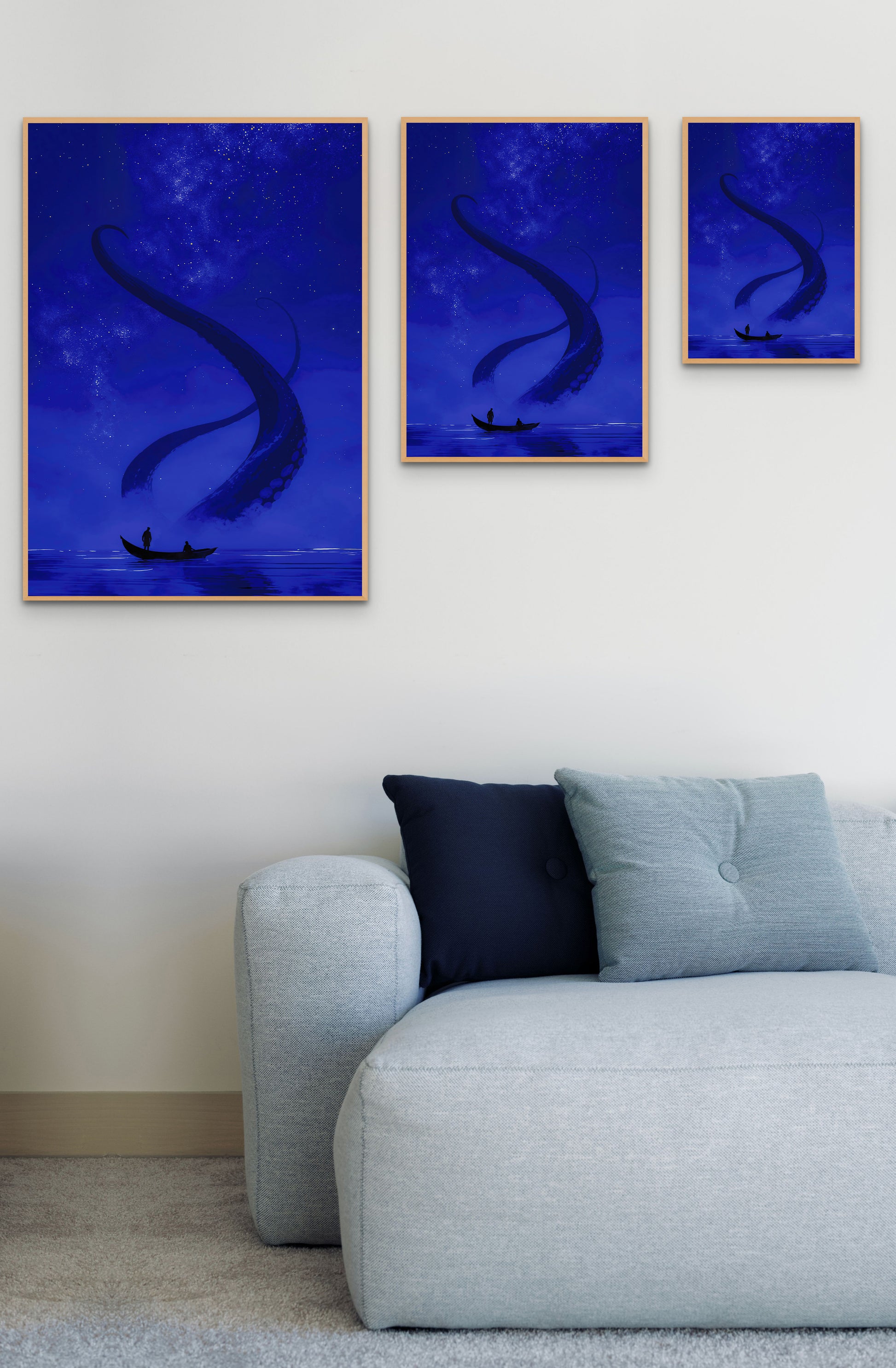 The sea’s depths mirror the expanse above, where the giant octopus reigns, entwining the fates of those who traverse its waters. In the rhythm of the waves, they encounter not just the depths of the ocean but the deeper vastness where sea and sky, reality and myth, become one.