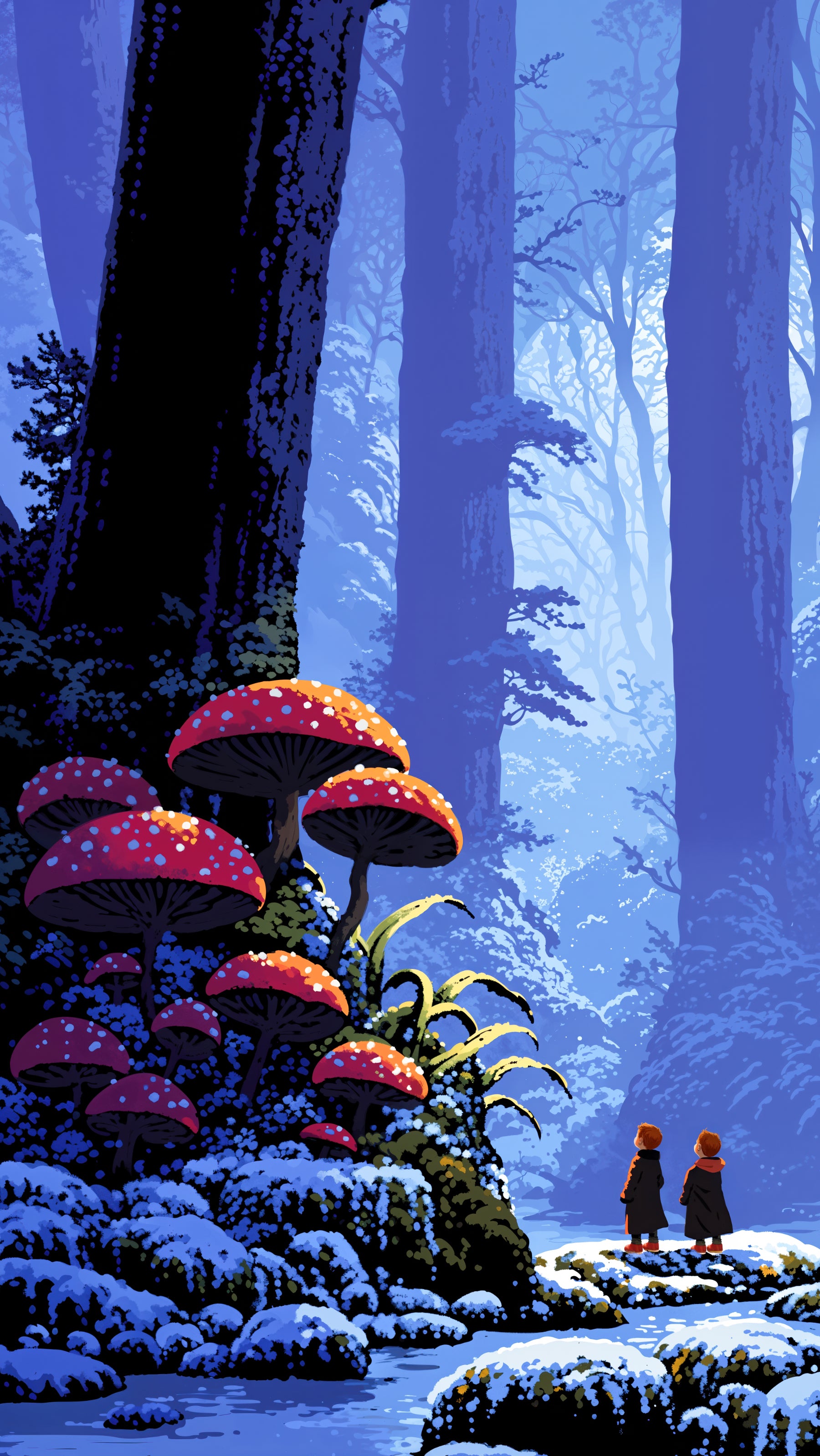 In a hidden corner of the world, a forest thrives peacefully. Gigantic mushrooms rise like natural monuments, their sheer size challenging the limits of the imaginable. This is a place where time seems to flow differently, where the air hums with the presence of something ancient. Those who enter the forest find themselves dwarfed by the colossal forms, each of their steps revealing the profound power of an ecosystem that thrives far beyond human influence.
