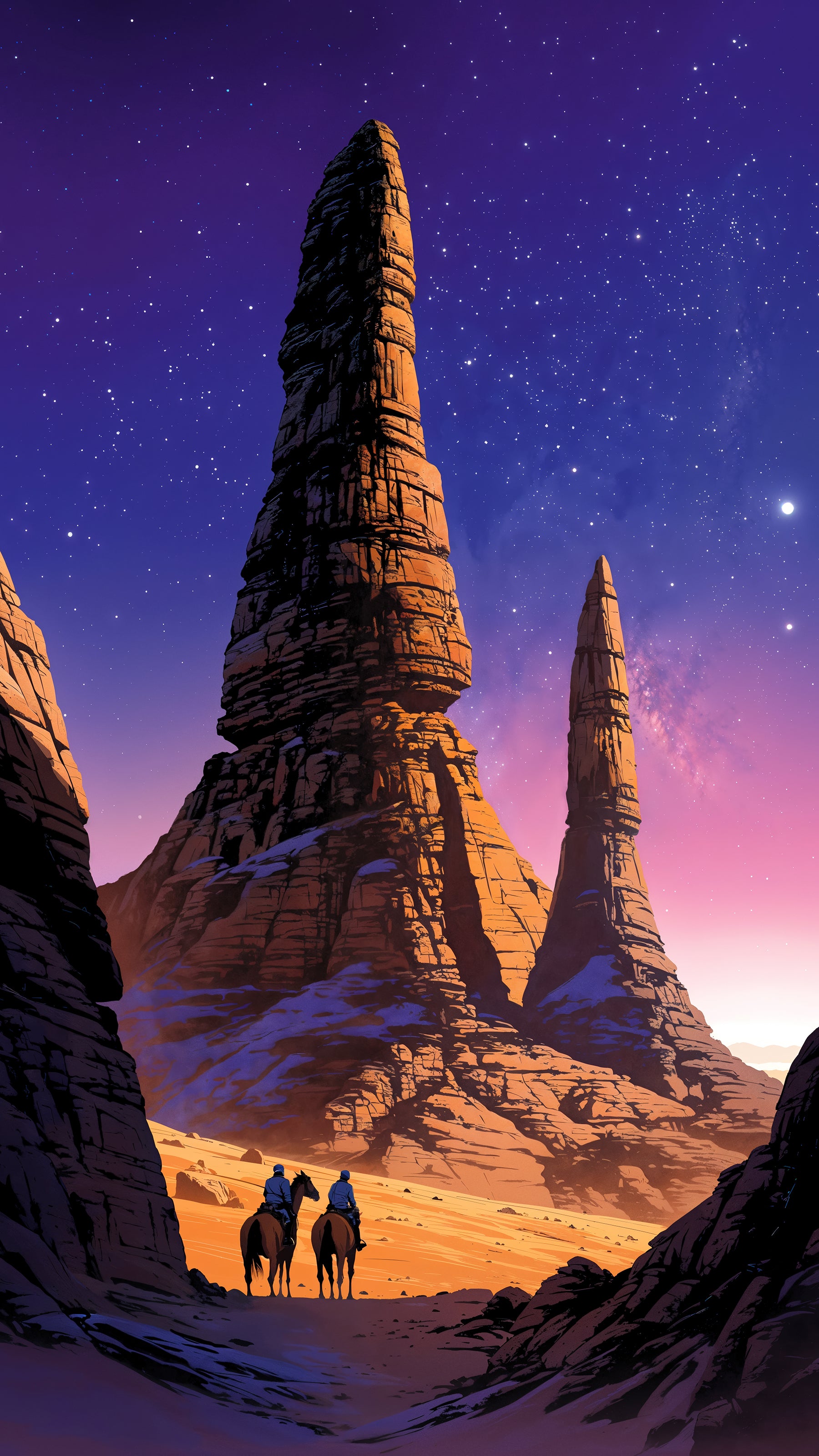 The spires had no names. No maps told of their shapes, nor did stories mark them. And yet, standing there as the sky bruised from violet to indigo, the two knew this place had seen more than history could hold.