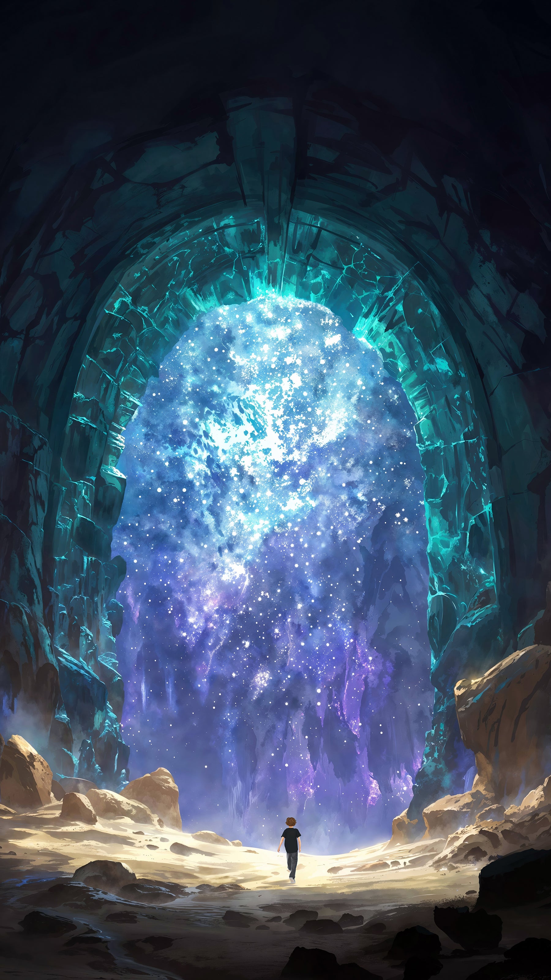 At the threshold of the cosmic passage, the lone boy confronted the profound - a visual manifestation of their subconscious. The glowing portal, a tapestry of stardust and light, symbolized the infinite possibilities that lie beyond the confines of the familiar. This moment, suspended in time, was an invitation to embrace the unknown and to recognize that the path to wisdom is illuminated by the courage to venture beyond the horizon of certainty.