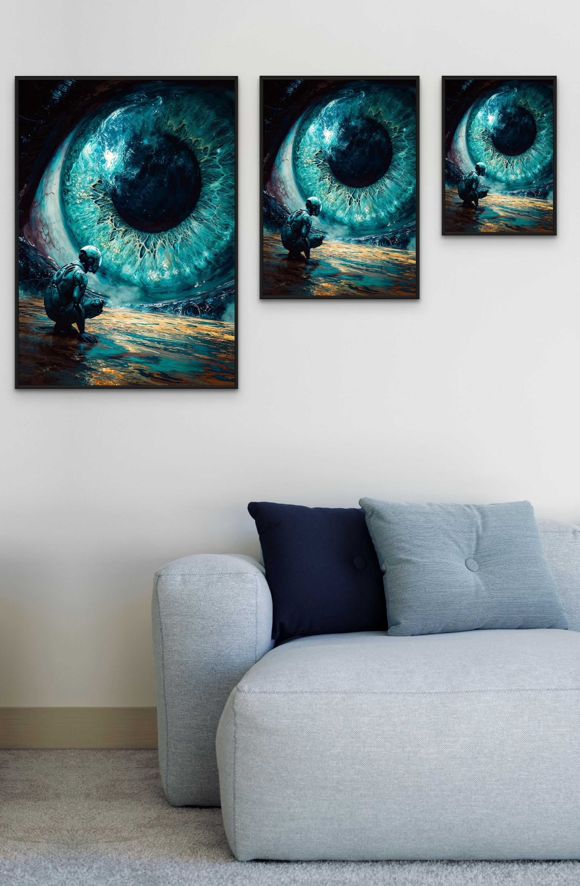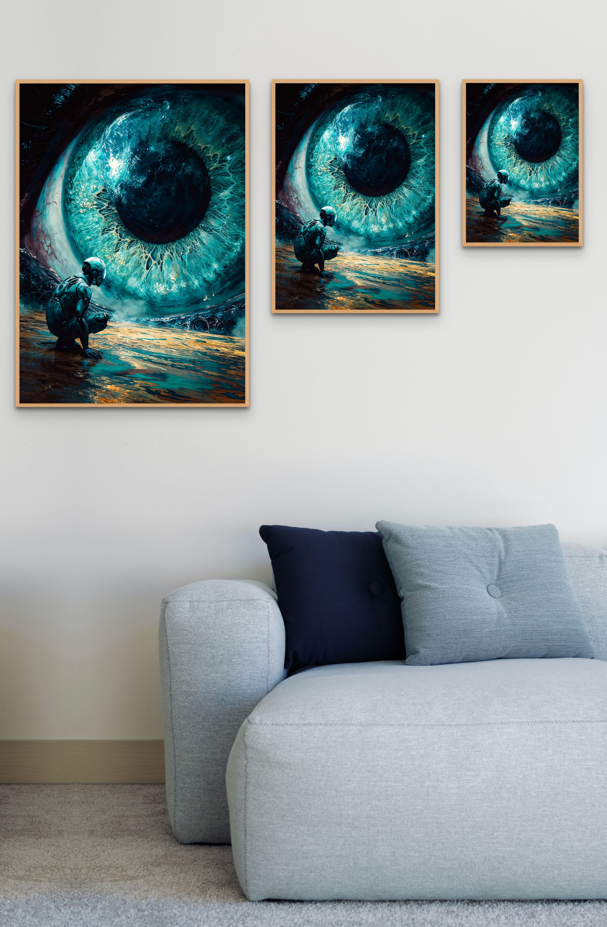 In life, we find ourselves both creator and creation, orchestrating the dance of our destinies amidst the cosmic symphony. Like the crouching robot before the colossal human eye, we confront the enigma of perception and consciousness. Are we mere observers in the universe’s grand spectacle, or are we integral actors, imbued with the power to shape our reality? Perhaps therein lies the paradox: to gaze into the infinite and yet remain confined within the boundaries of our own understanding. The convergence of artificial and organic echoes our perpetual quest for meaning in a universe that whispers its secrets through the lens of perception.