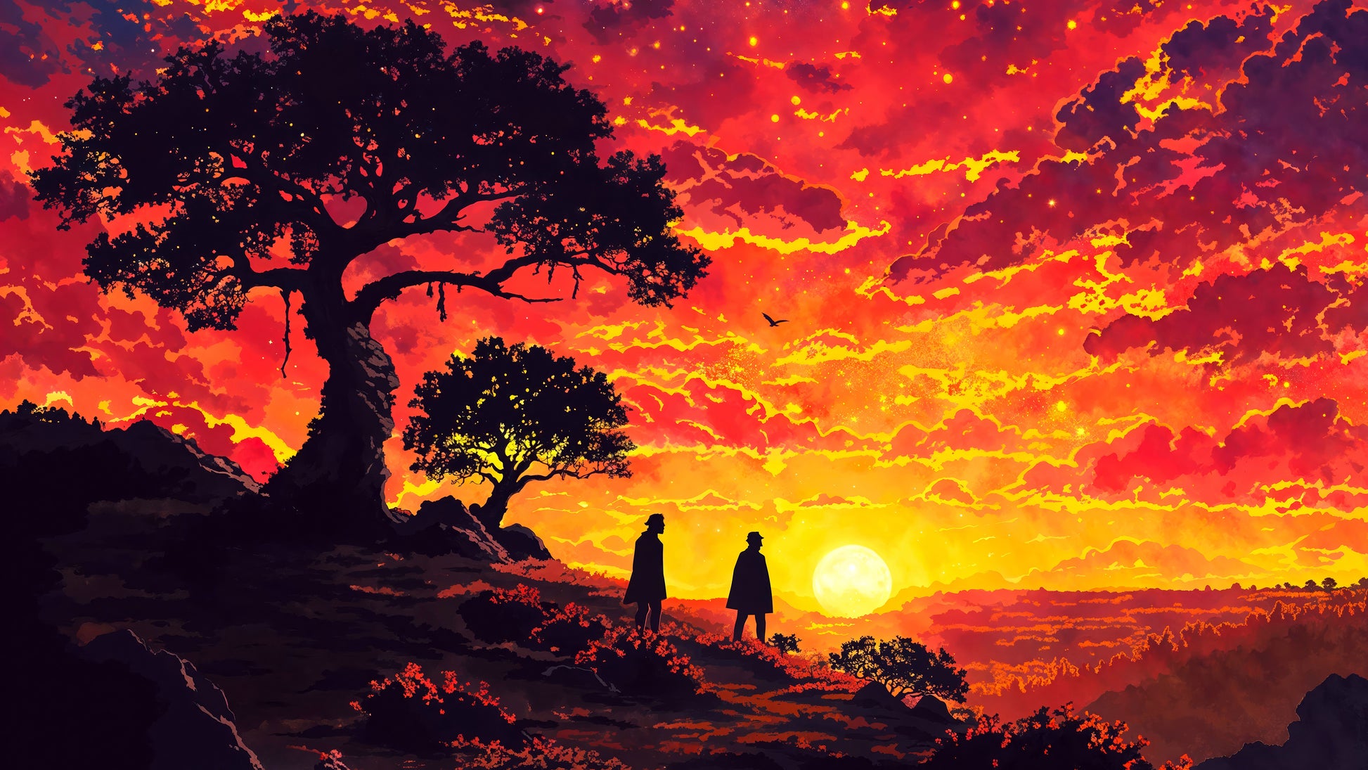 Near the old tree, two souls stand in awe, the sky ablaze with the day’s last fiery breath yielding to a tapestry of night, where stars ignite in a spectrum of celestial wonder.