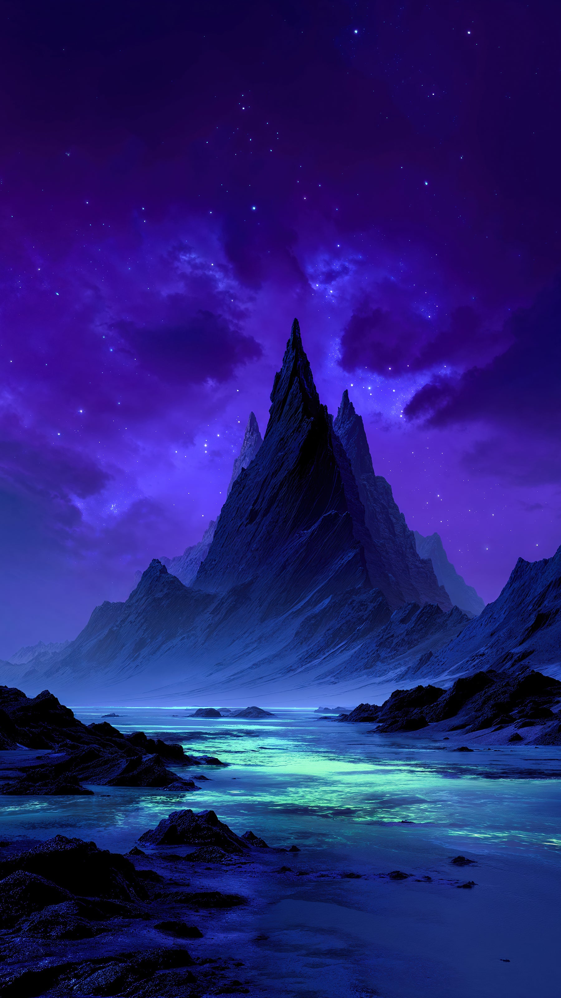 In this place, even the stars seemed to hesitate, their reflections caught in the glowing waters below. The jagged peaks pierced the heavens like broken teeth, ancient and unmoved by time. The air was thick with a silence that pressed against the rocks and the luminous shallows, as if the world had forgotten how to breathe.
