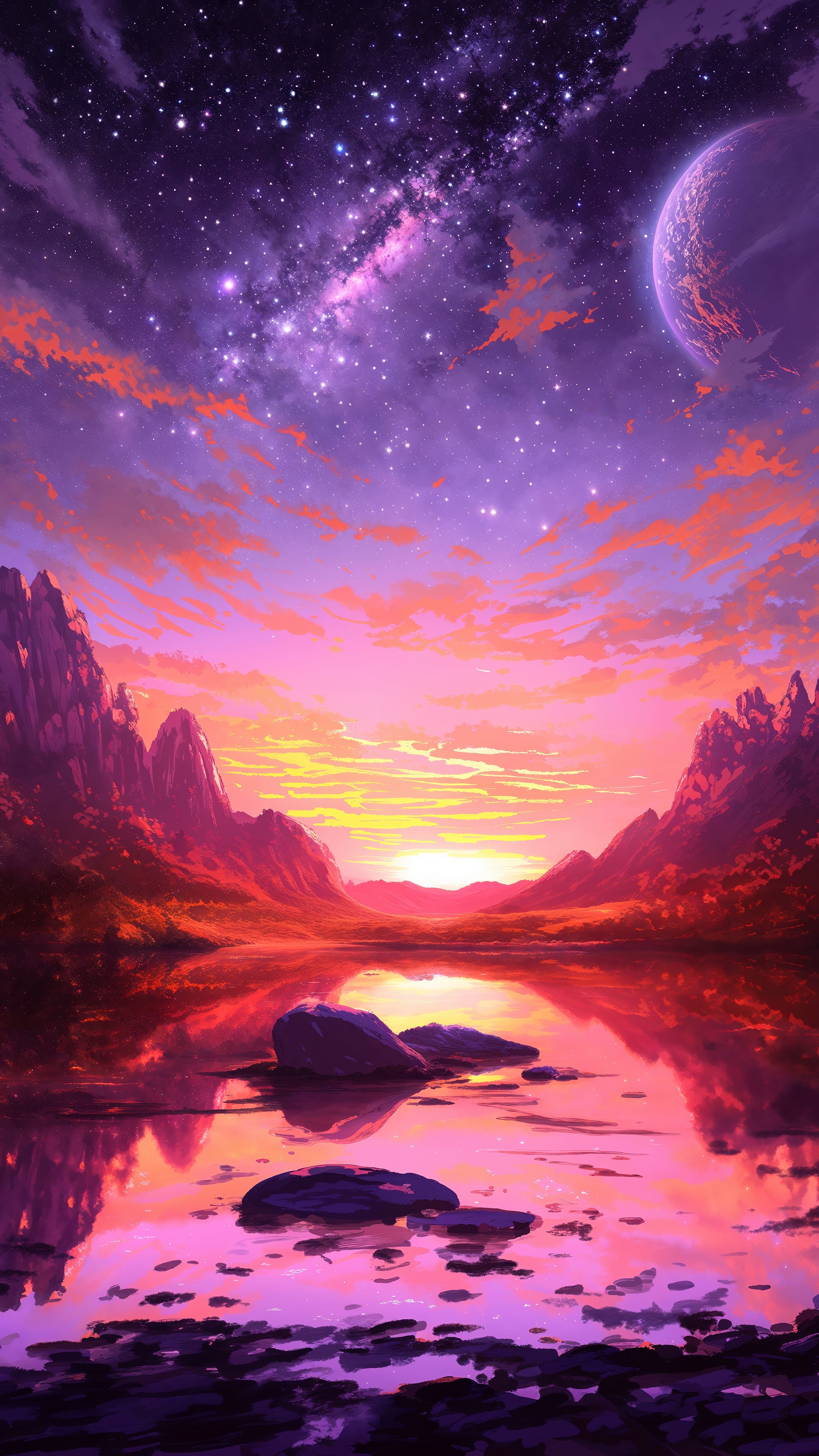 Nareth, I’m calling it now. It wasn’t on any of our primary scans . Just a shimmering basin tucked between jagged ridgelines, still and vast. It caught the last light of Astraio’s day — streaks of orange and violet mirrored in perfect silence. Above us, the dusk sky burned with stars and the brightness of Orionis' galaxy. Virelia loomed massive, serene, almost watchful.
