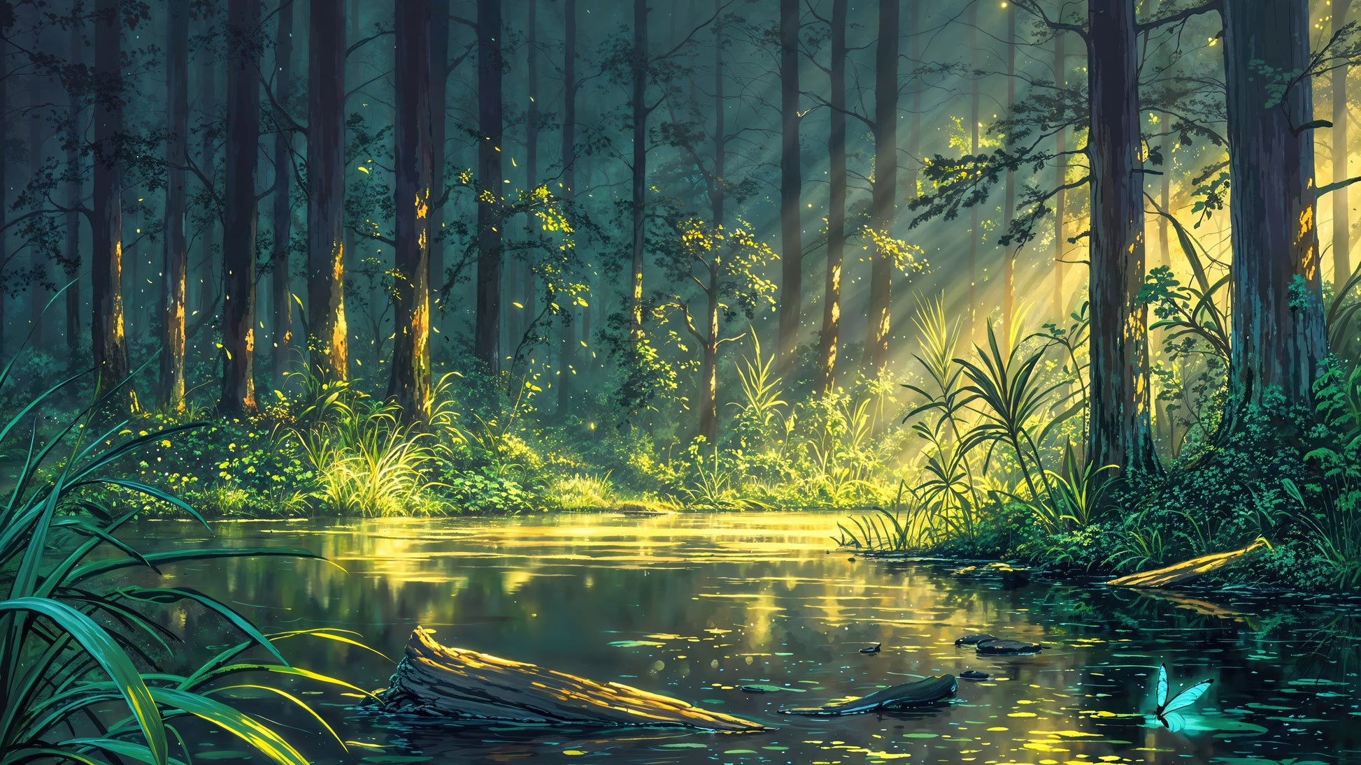 Between these ancient gateways, the forest thrives. Sunlight filters through the dense canopy, illuminating parts of the woods, where nature holds sway. One part of the forest is peaceful, bathed in warm light; in another part, a glowing blue firefly drifts through the swamp, its soft luminescence an echo of the fading magic that once controlled these lands.