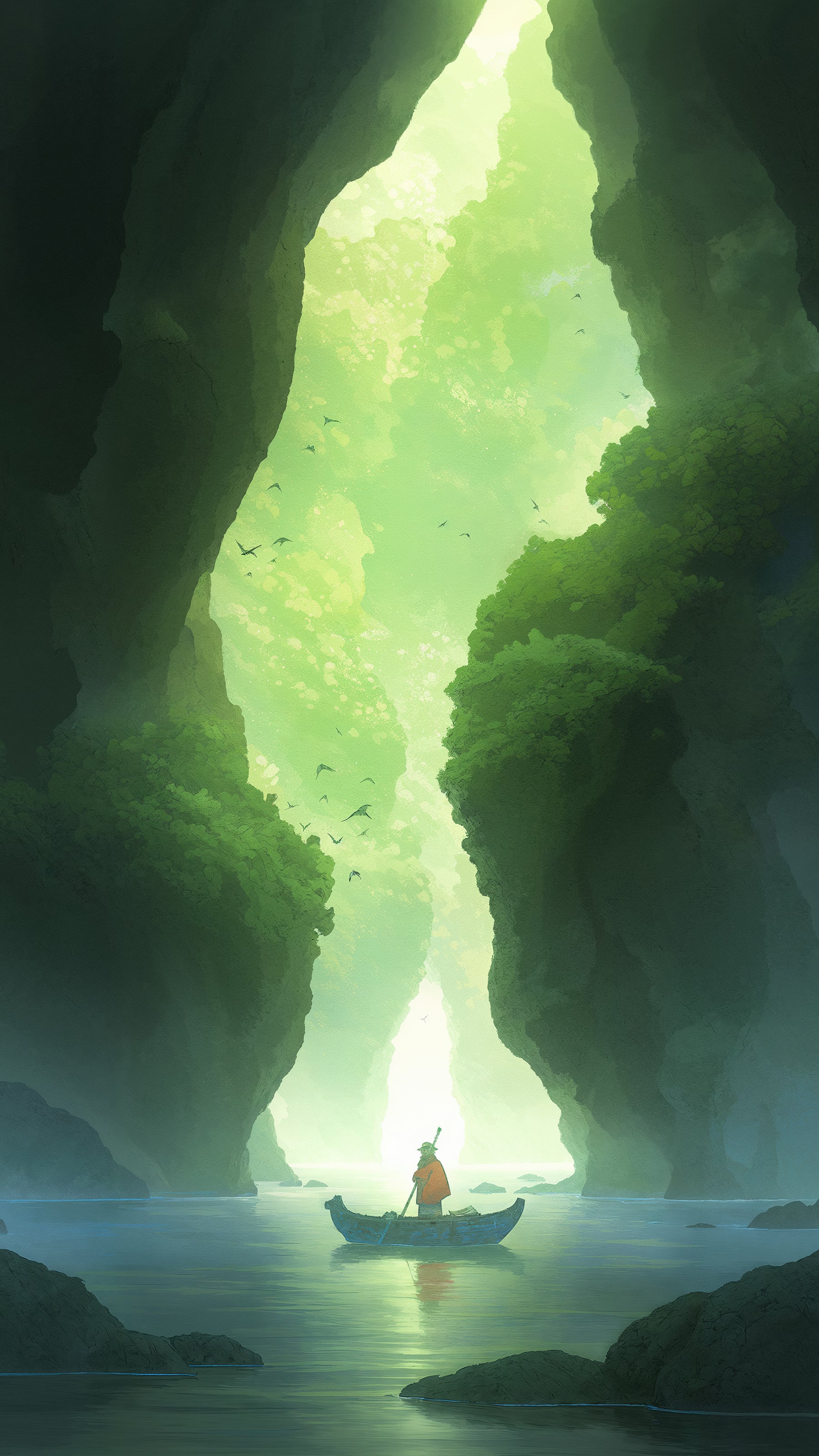 The cliffs rise, their surfaces worn by time, their crevices sheltering moss and vines that cling with quiet persistence. The traveler listens with presence. He absorbs the slow patience of stone, the ceaseless whisper of water, the effortless grace of the birds who know no boundaries.