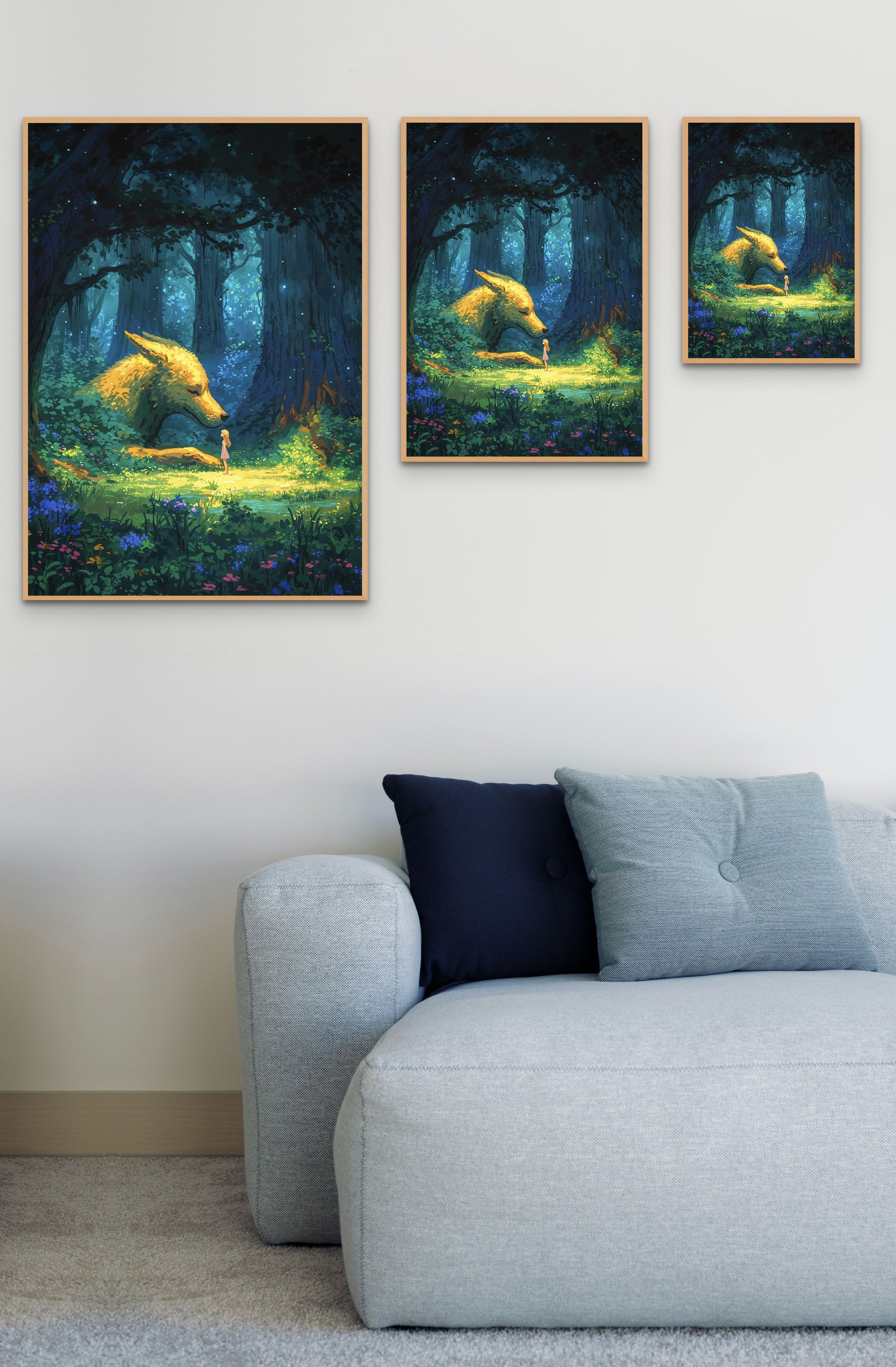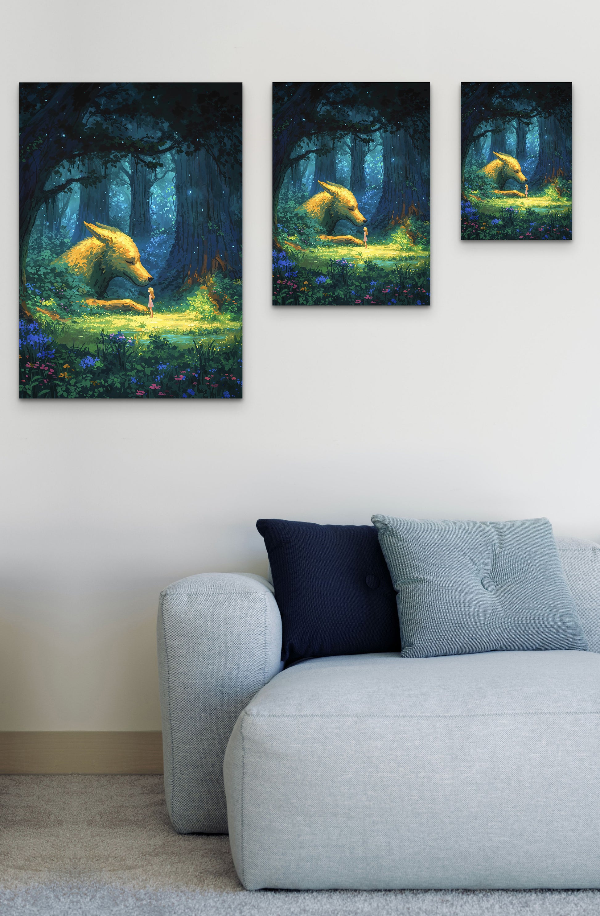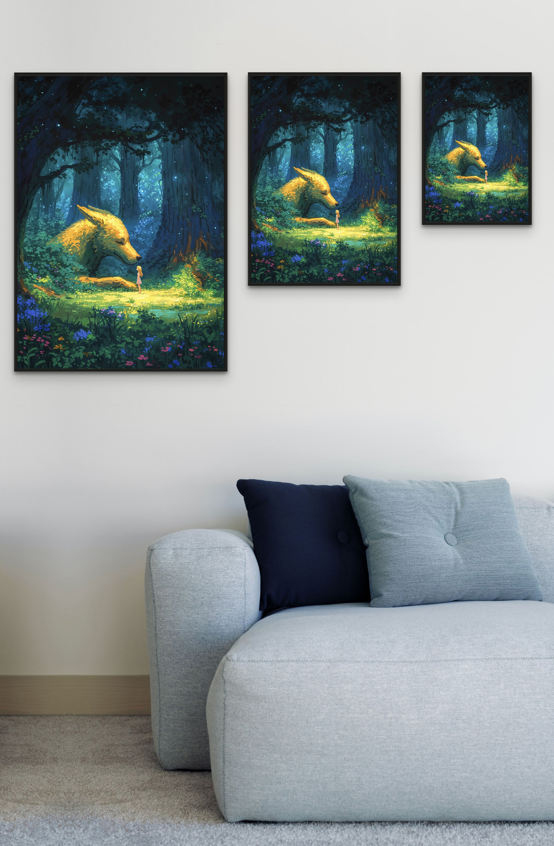 The forest, alive with the magic of ages past, holds its breath, as if aware of the sacred bond forming between these two souls. In this enchanted place, time slows, and the world outside fades away, leaving only the gentle whispers of the grove and the promise of a friendship that transcends worlds.