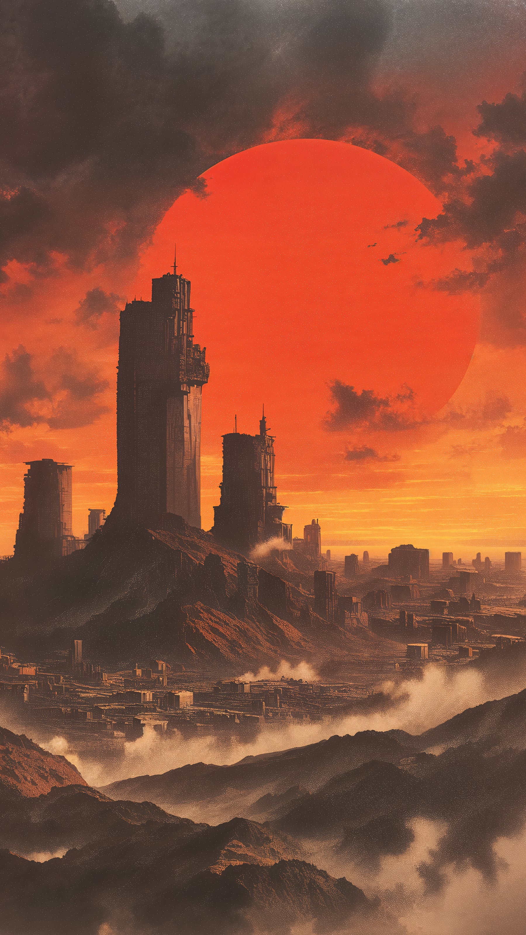 In the valley where mountains breathe and the mist never lifts, time has slowed to a reverent crawl. The red sun looms low, impossibly large, simply watching. Towers stretch from stone like relics of a forgotten ambition, their surfaces worn by wind and silence. No one remembers who built them, or what they reached for. All that remains is the quiet, and the feeling that something once great passed through this place... and may yet return.