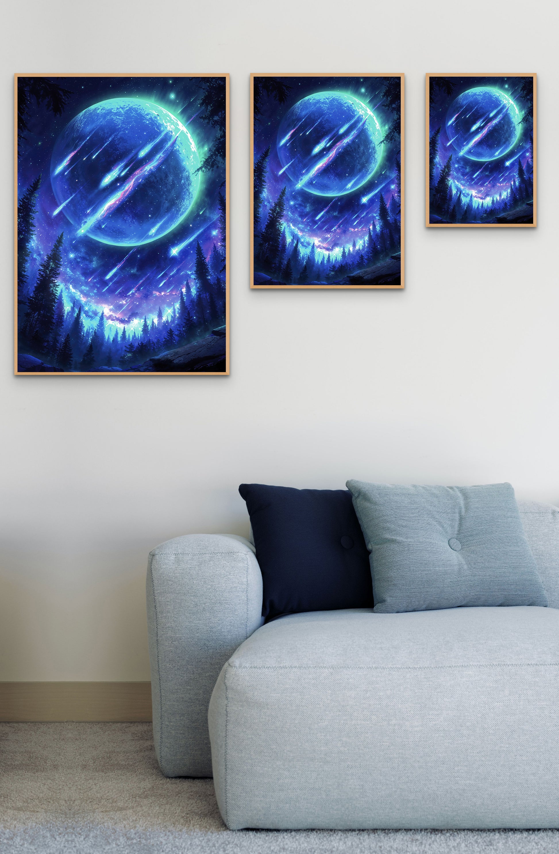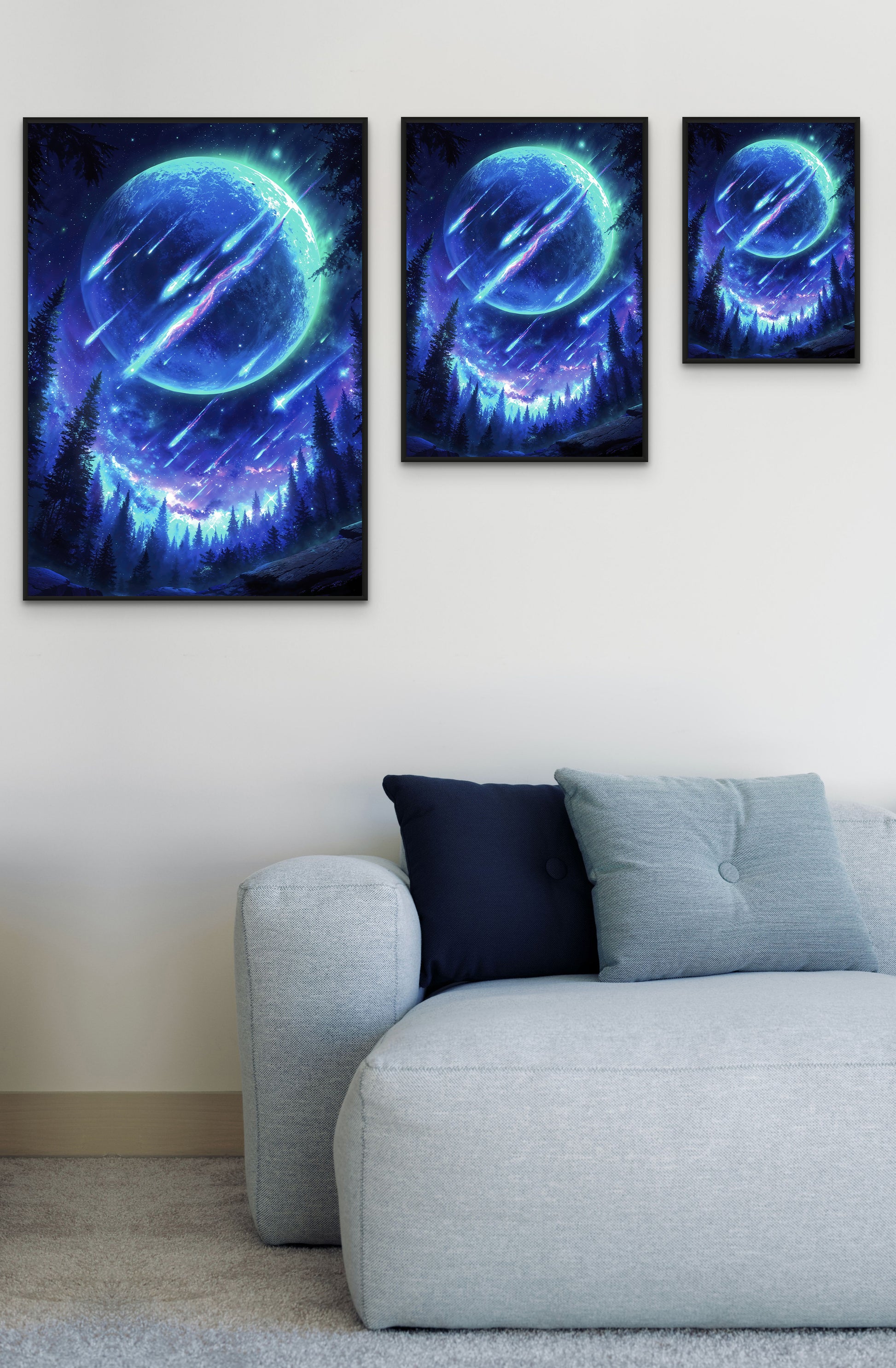The night sky became alive with streams of celestial light. The glowing planet, vast and mysterious, hovered in the distance, releasing tendrils of cosmic energy. The forest below was illuminated by this otherwordly spectacle, standing as the favored witness to a conversation between worlds.