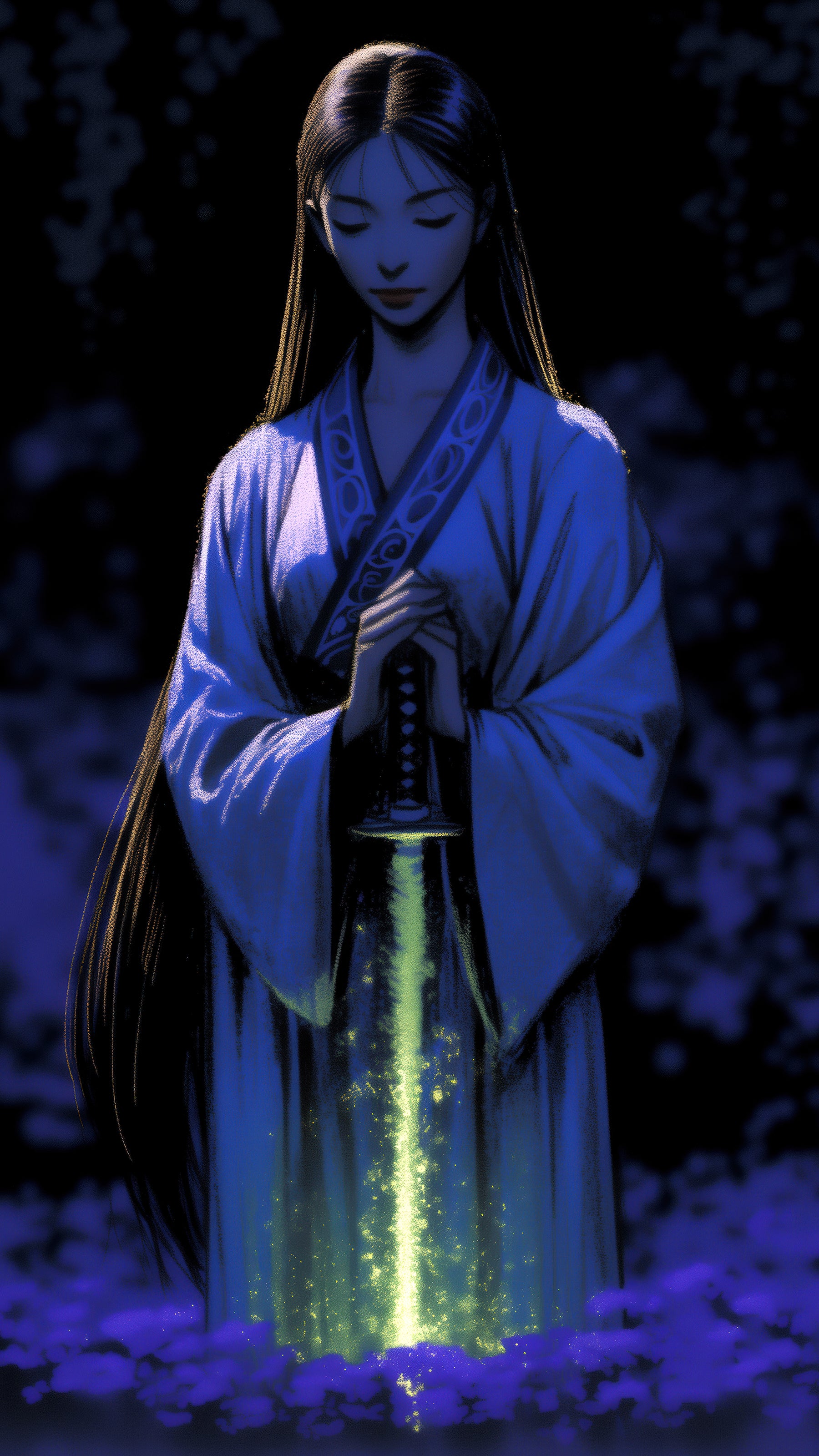 The sword in her hands does not thirst for blood. It hums with older things: roots and vows, silence and soil. She is not alone, though no one ever finds her. She is held by the land, and in turn, she holds it.