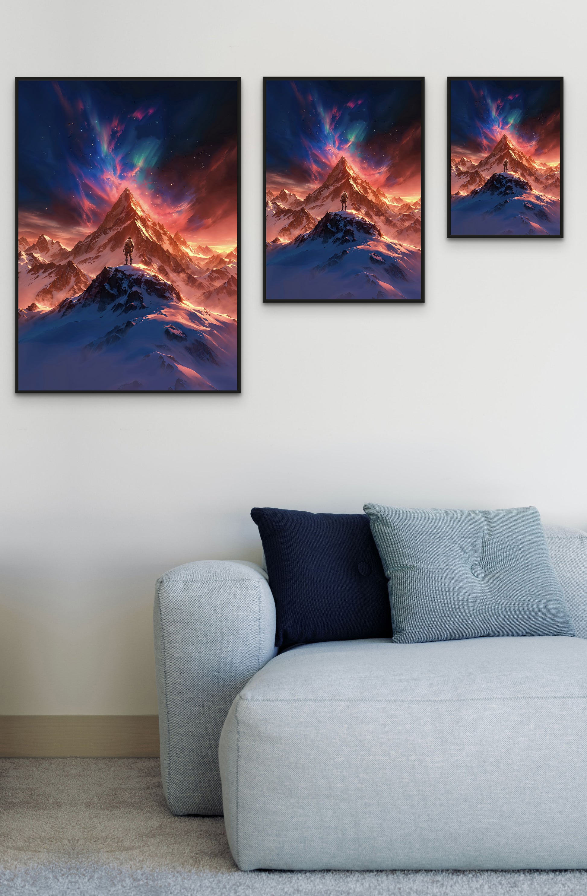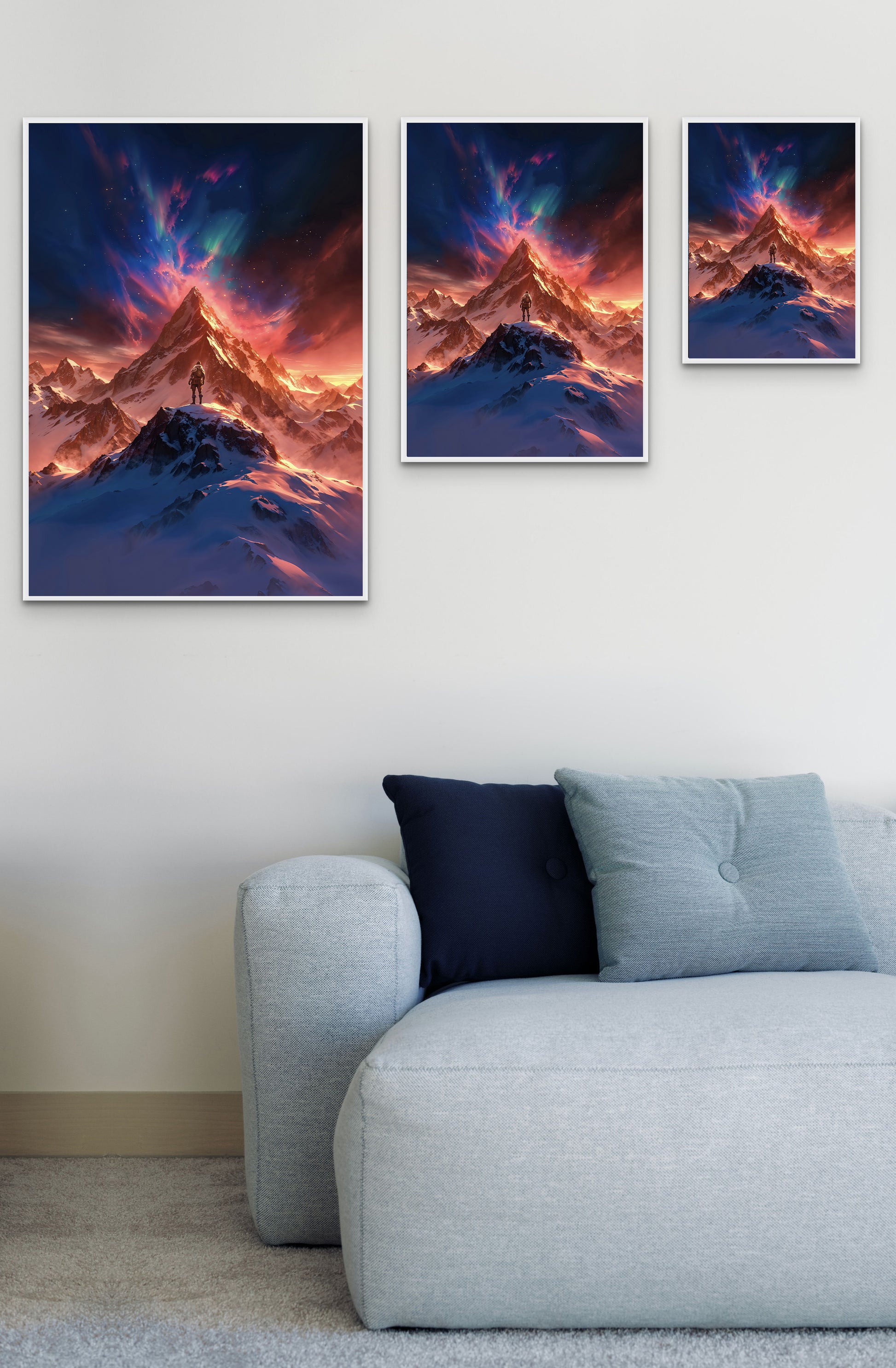 After years of preparation, the climber finally reaches the peak of the world's tallest mountain. Bathed in the warm light of the setting sun, they stand alone, staring into the sky as the heavens themselves respond to their triumph. The aurora above dances like flames, mirroring the fire that burns within the climber’s heart.