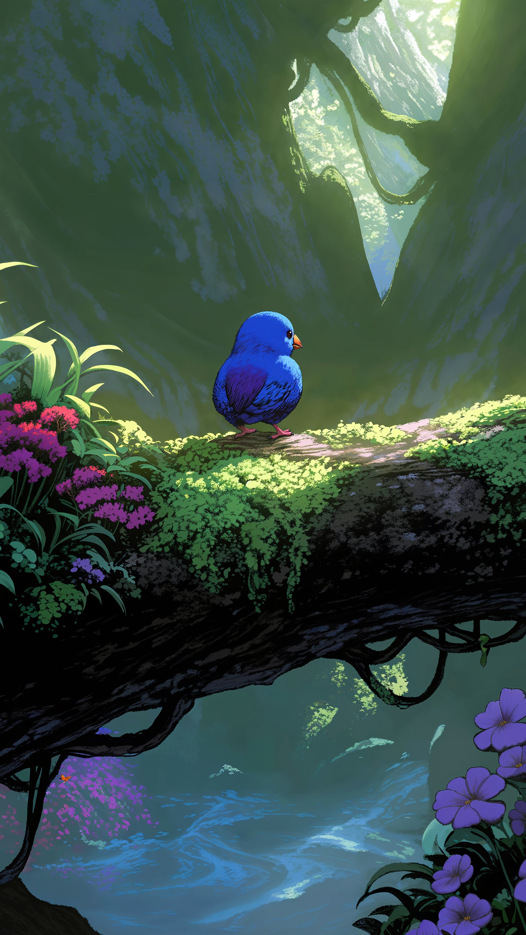 Further on, the forest deepened. Cliffs rose, solemn and tall, cupping the river in their embrace. Broad lily leaves drifted across the surface, untroubled. Light filtered in from above, casting shifting patterns through branches and leaves. The interplay of shadows and reflections danced across the cliffs and water, as if this world moved in quiet rhythm.